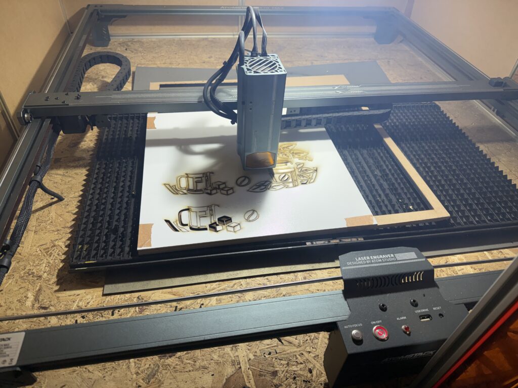 Das ganze hat den Vorteil das es dauerhaft wiederverwendbar ist, weil besonders der Diodenlaser das Material nicht schneiden kann. Viel wichtiger ist aber, das es somit möglich sein sollte den Air Assist weiter zu verwenden. Denn der Luftstrom kann so durch das Gitter entweichen und wird nicht wieder mangels fehlender Abstrommöglichekiten unter das geschnittene Objekt und wieder zurück geleitet. Ein Abheben der Kleinteile sollte somit verhindert werden.