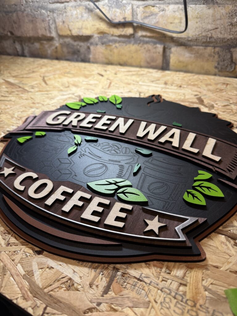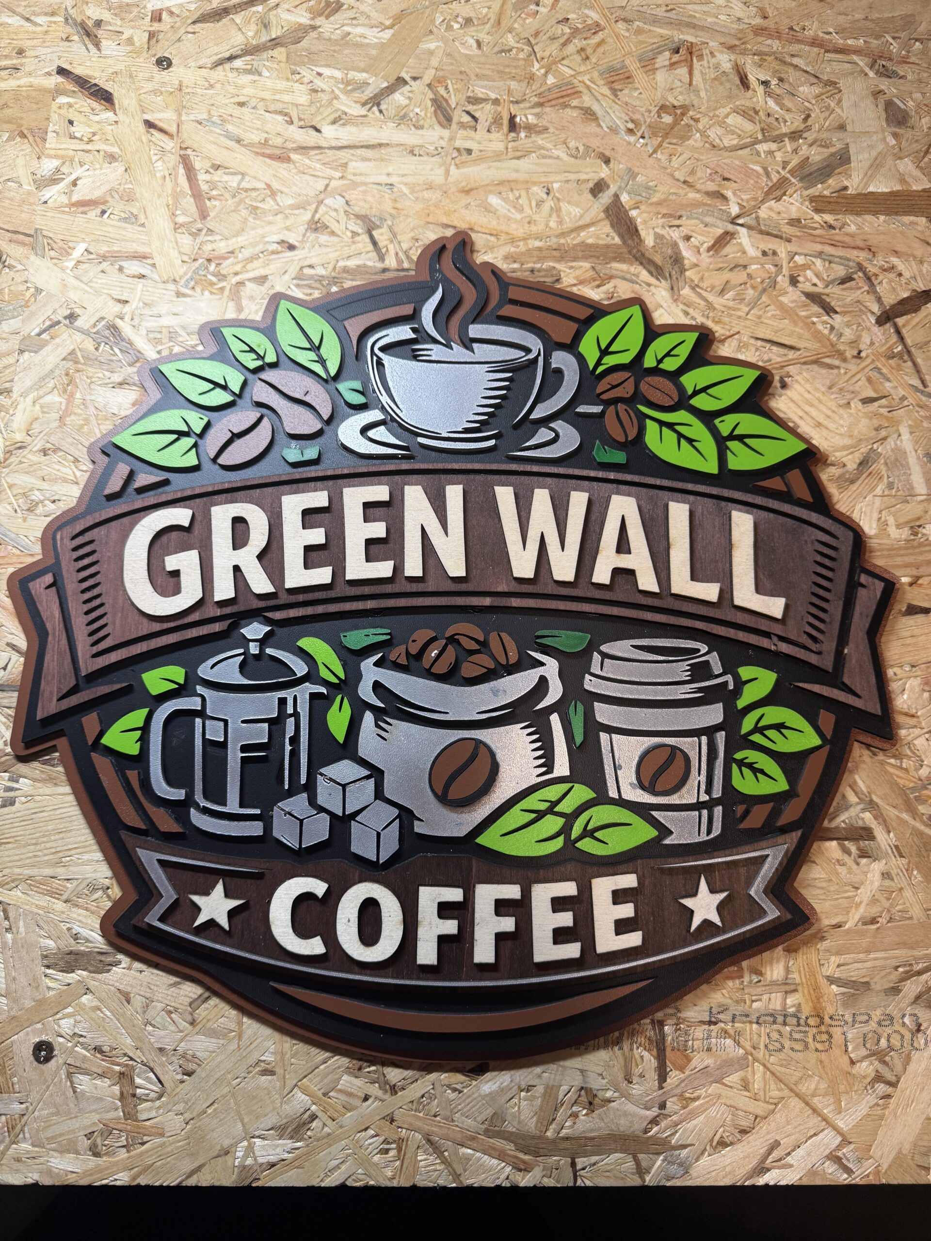 Bei diesem Projekt habe ich ein mehrschichtiges Coffee-Schild im Layered-Look umgesetzt. Ziel war ein plastisches Design mit klaren Ebenen und vielen kleinen Details wie Kaffeebohnen, Blättern und Zubehör.